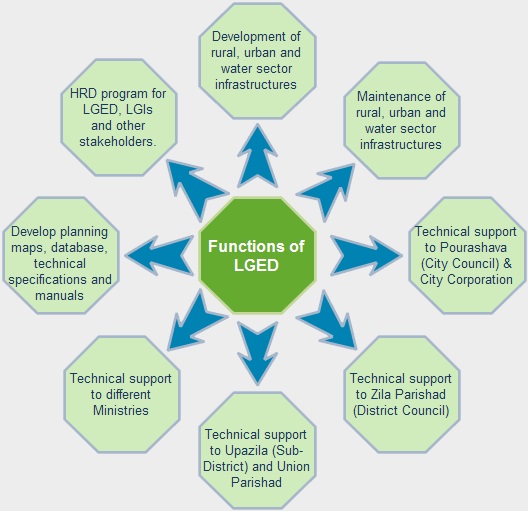 এলজিইডি সরকারি সংস্থা হিসেবে পেশাদারিত্ব, দক্ষতা ও কার্যকরভাবে নিম্নোক্ত পরষ্পরসম্পর্কীত ও সহায়ক কার্যক্রমসমূহ বাস্তবায়নে ভূমিকা পালন করবে: